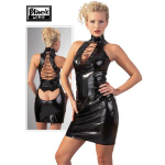 Stoere uitziende lak jurk met een hoge kraag en een diepe decolleté. Aan de voorzijde van de jurk zit een veter die u kunt aanrijgen voor de perfecte pasvorm. Aan de achterzijde van het lak jurkje is het uiterst spannend door de hele lage snit op de rug en ter hoogte van de billen zit een speciale uitgewerkte opening voor een erotische tint.
