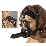 Lederen hoofdharnas met dildo en mondbal € 69,95 Latex dildo met een afmeting van 13 cm lang, Ø 3,5 cm.
